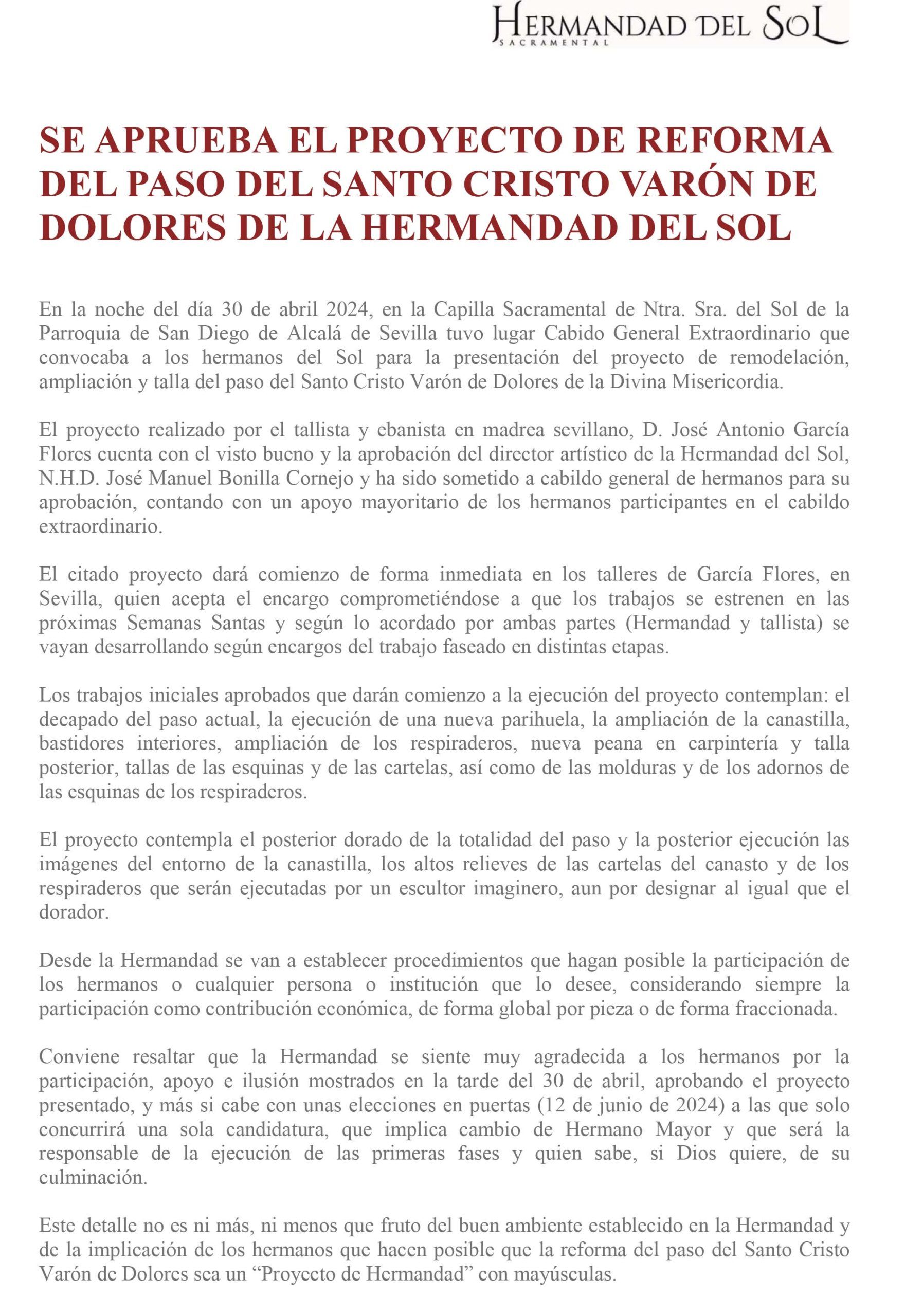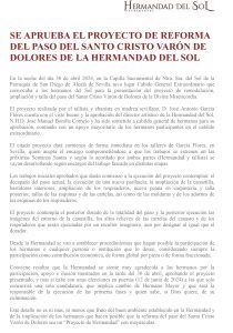 se aprueba el proyecto de reforma del paso del santo cristo varón de dolores de la hermandad del sol