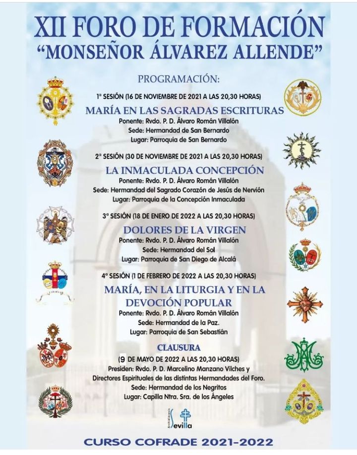 El próximo Lunes 9 de Mayo a las 20:30 h. En la Capilla Nuestra Señora de los Ángeles de la Hermandad de los Negritos Clausura del XII Foro de Formación "Monseñor Álvarez Allende" Presidido por D Marcelino Manzano Vilches y los distintos Directores Espirituales de las Hermandades participantes en el Foro