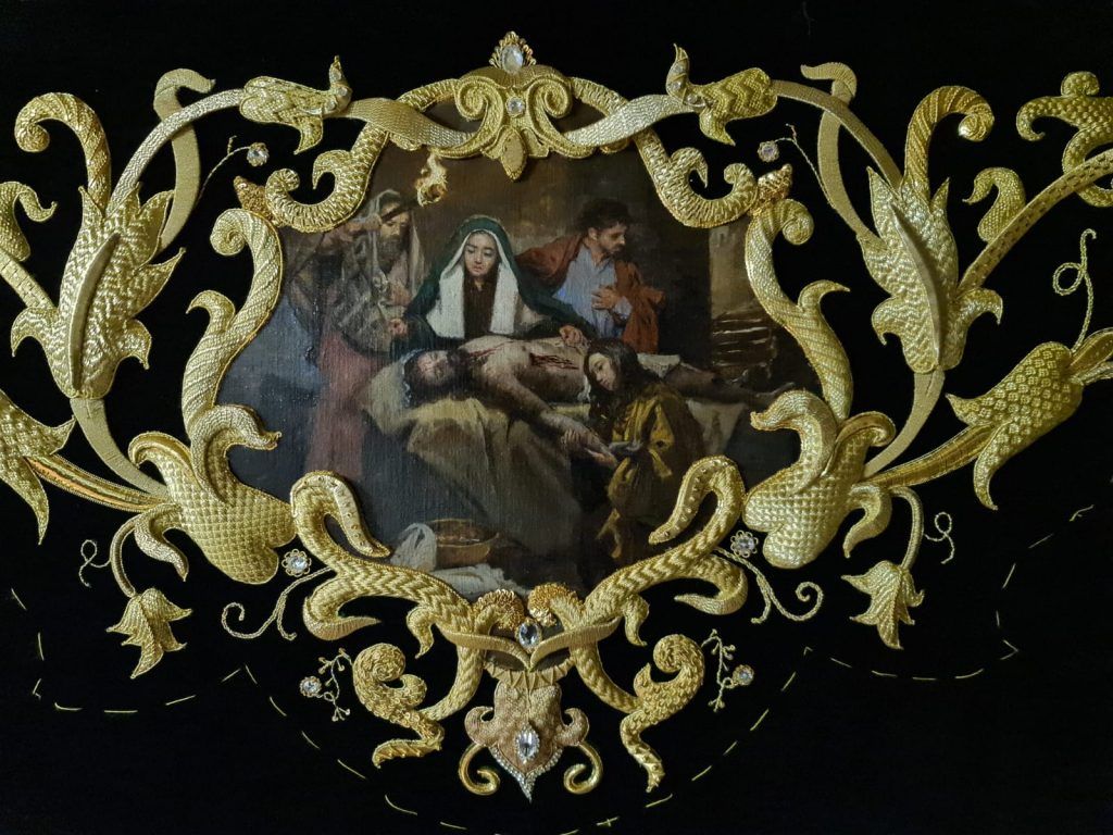 Siguiendo la línea artística del resto de bambalinas, en esta ocasión la cartela donada por un hermano, está dedicada a nuestra querida Hermandad del Santo Entierro y que junto al «Triunfo de la Santa Cruz» formarán parte de una de las dos bambalinas laterales.