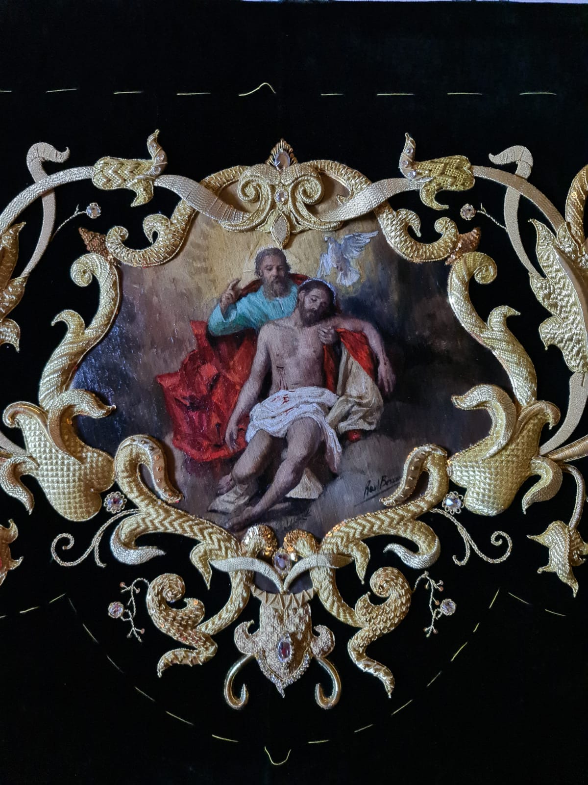 Siguiendo la línea artística del resto de bambalinas, en esta ocasión la cartela, está dedicada a nuestra querida Hermandad de la Trinidad.